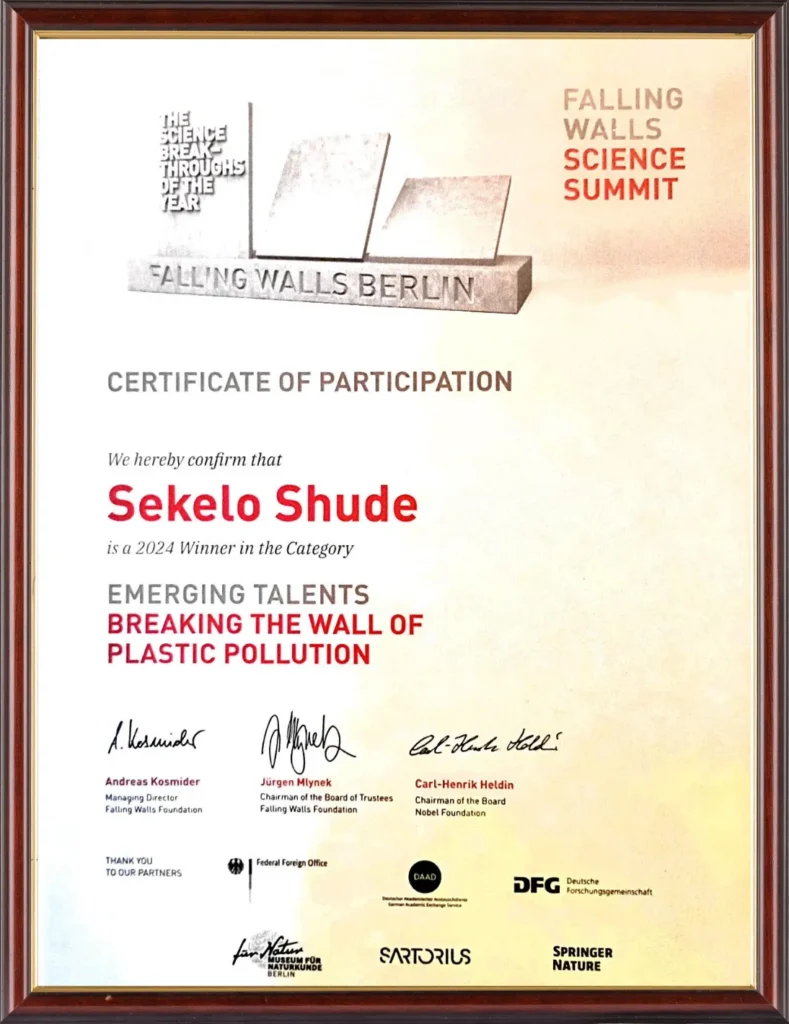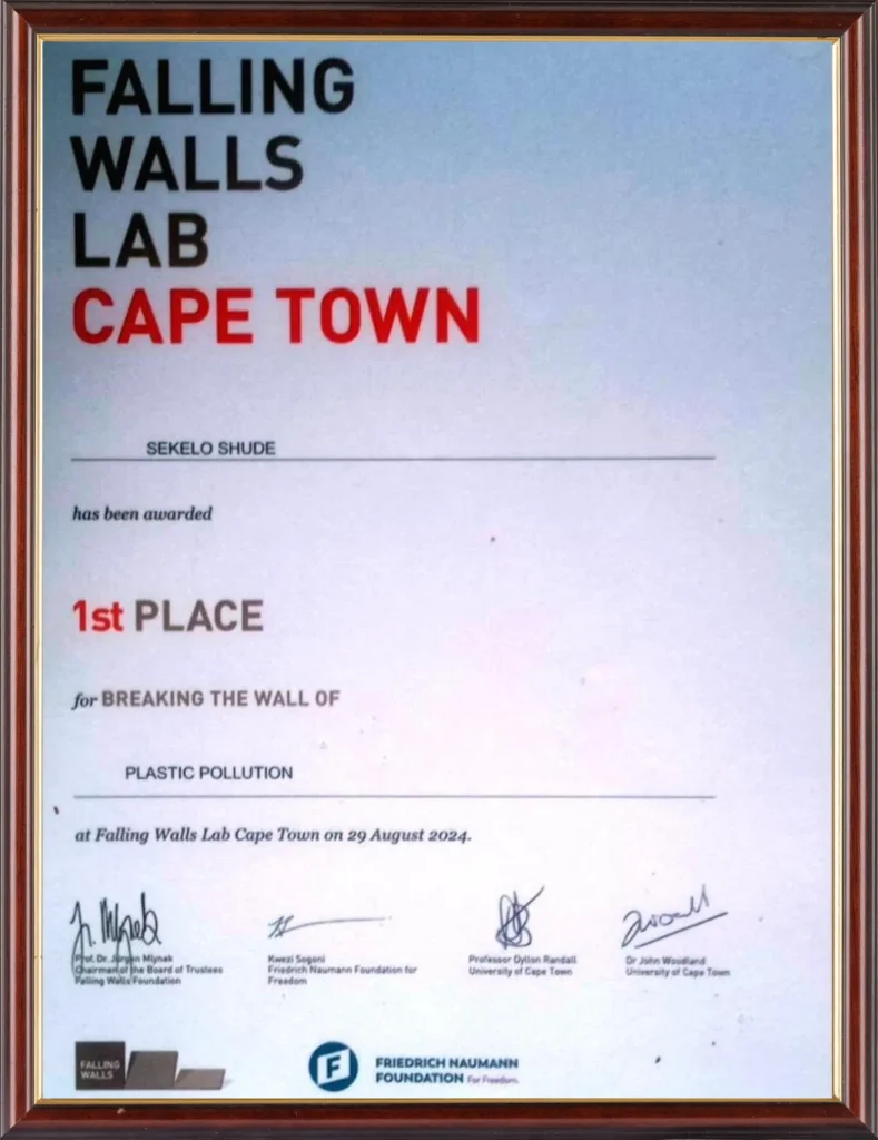 Our founder Sekelo Shude was recognised as a 2024 winner in the Emerging Talents category at the Falling Walls Science Summit for innovative work focused on breaking the wall of plastic pollution. This international platform celebrates solutions with global impact.